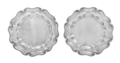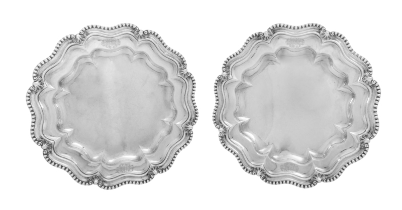 each of undulating circular form with raised beaded borders spaced by shells, engraved on opposing sides with mantled coats of arms.