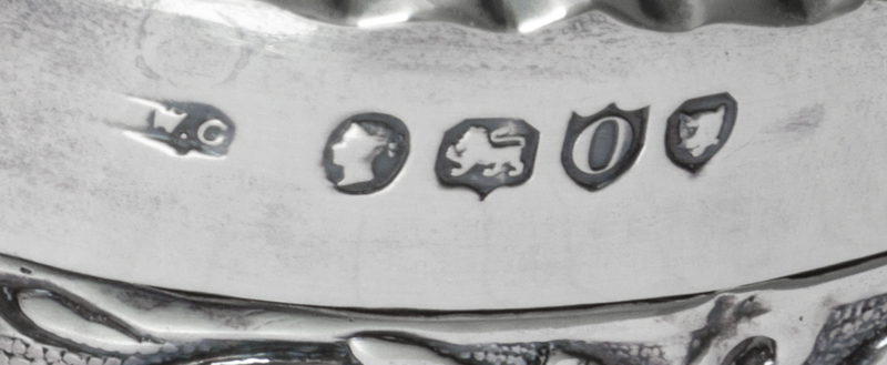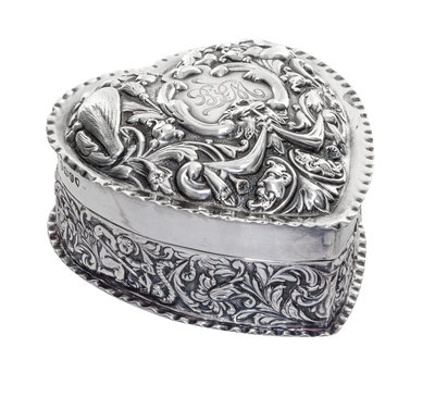 in the form of a heart, the lid worked with mask, bird and C-scroll decoration.