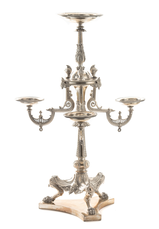 the central baluster form stem supporting a central dish and worked to show helmets, male masks and foliate decoration, further issuing three scroll arms with beaded decoration, raised on a tripartite base with hairy paw feet.