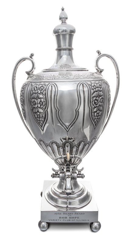 of baluster form with top finial, the base with engraved inscription 1958 Heart Award/ to BOB HOPE/ Variety Club of Illinois.