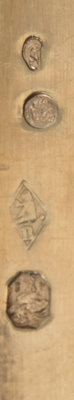 comprising 12 knives, 12 forks and 12 spoons, the knife handles decorated with Neoclassical floral, volute, mask and maiden motifs, the spoons and forks of Fiddle and Thread pattern engraved on the undersides with the coat of arms and coronet of Pauline and Camillo Borghese.