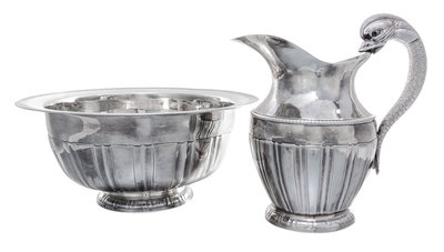 the ewer with a dolphin handle, the bowl with a ribbed edge.