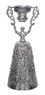 in the form of a maiden holding a swiveling cup aloft, her dress forming a larger cup, worked to show floral, foliate and putti decoration.