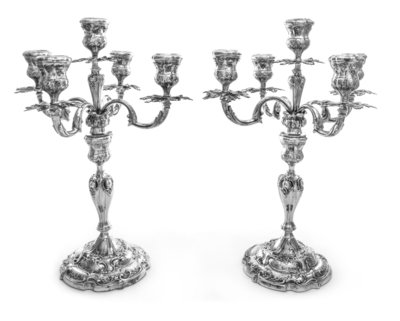 having four branches surrounding a central stem, the cups of paneled baluster form surmounting a foliate form bobeche, the stem of baluster form with C- and S-scroll decoration throughout and raised on a similarly decorated base.