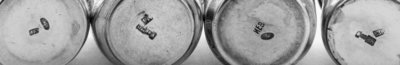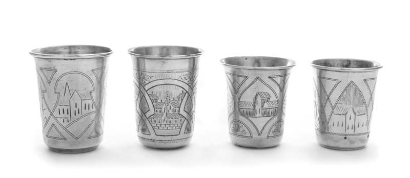 each having a fluted rim, the body worked to show foliate decoration and village scenes.