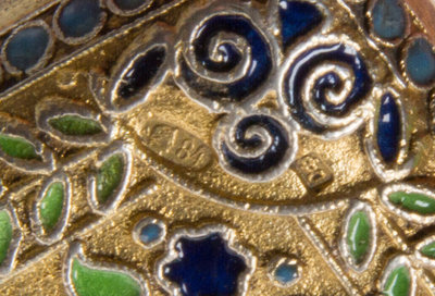 the case having a matte gilt ground with foliate and geometric enameling throughout.