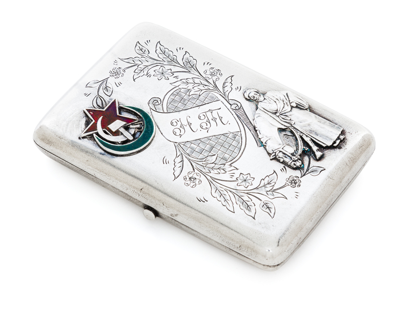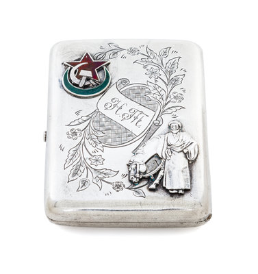 the hinged lid centered by a Cyrillic monogram against an engraved background beneath an applied Soviet hammer, sickle and star above a green crescent moon, the lower half with an applied figure of a man leading a horse.