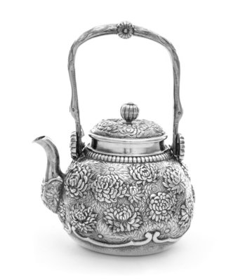 the body of globular form, finely chased with blooming chrysanthemums, having a curved side spout and an overhead handle with two chrysanthemum shaped terminals, together with a hardwood stand.