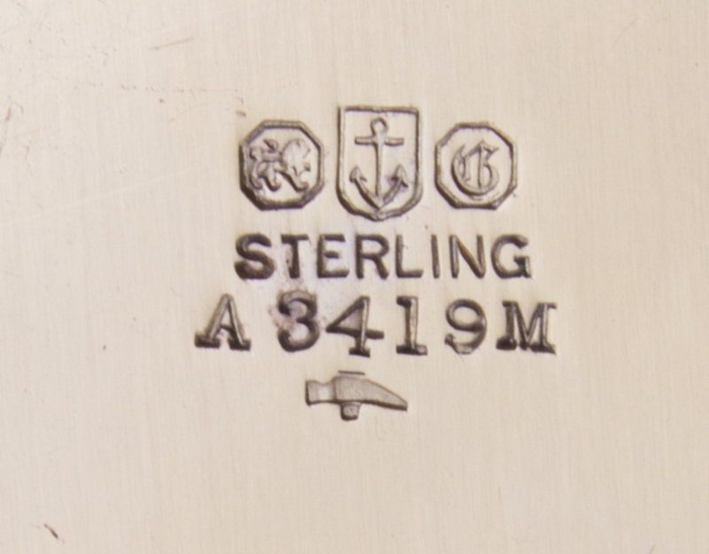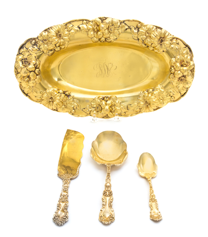 retailed by Spaulding, the handles decorated with floral and foliate decoration throughout, comprising twelve ice cream spoons, a sugar spoon, a berry scoop and a cake server, together with a similarly decorated dish bearing a 1902 Gorham date mark.