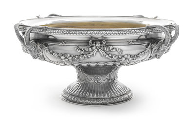 the rim having an acanthus decorated band, the body with ram masks, floral and ribbon swag decoration, raised on a fluted base.