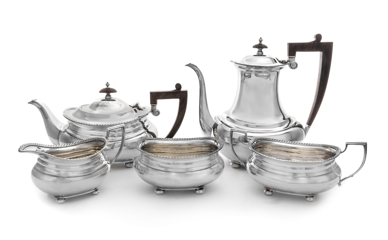 comprising a coffee pot, a teapot, a covered sugar, a creamer and a waste bowl, each having a gadrooned rim.
