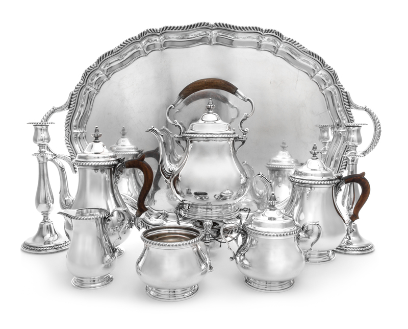 comprising a coffee pot, a teapot, a kettle on stand, a creamer, a two-handled covered sugar, a waste bowl and an associated silver-plate tray, together with two weighted candlesticks, each having a gadrooned rim.
