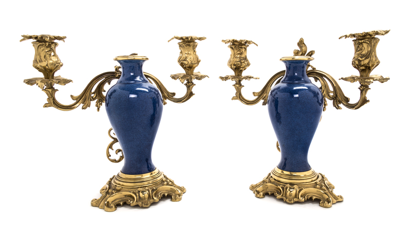 the vases of baluster form with blue glaze, mounted as two-light candelabra having foliate branches.