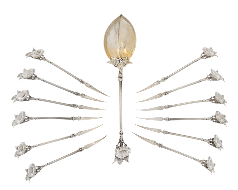 comprising twelve picks and a serving spoon in the Morning Glory pattern, retailed by William Brady, Harrisburg, PA.