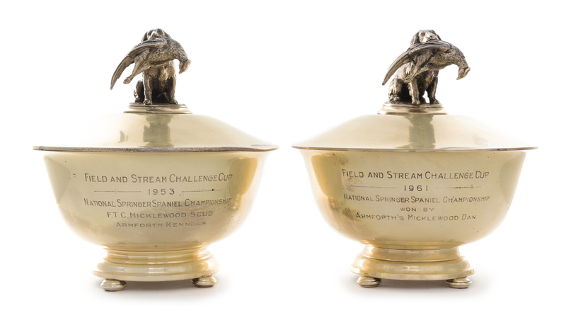 the lid finial in the form of a spaniel retrieving a pheasant, the body engraved with a Field and Stream Challenge Cup championship dedication and raised on four flattened bun feet.
