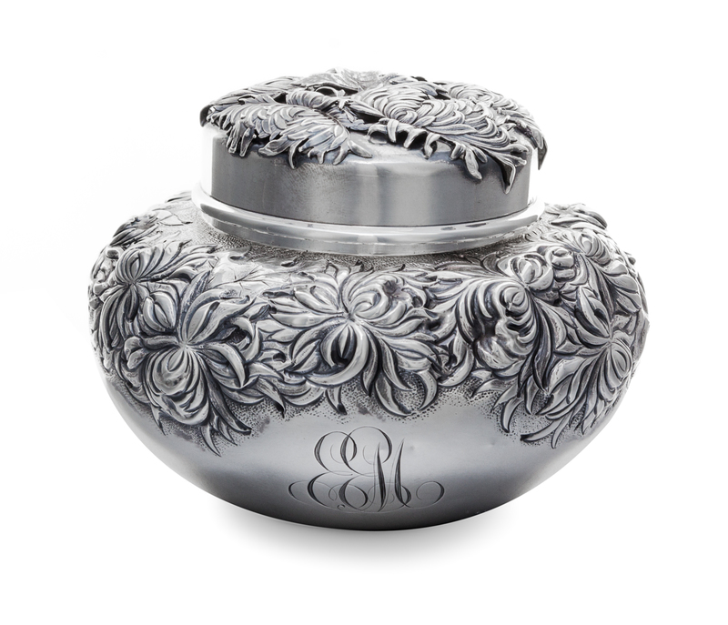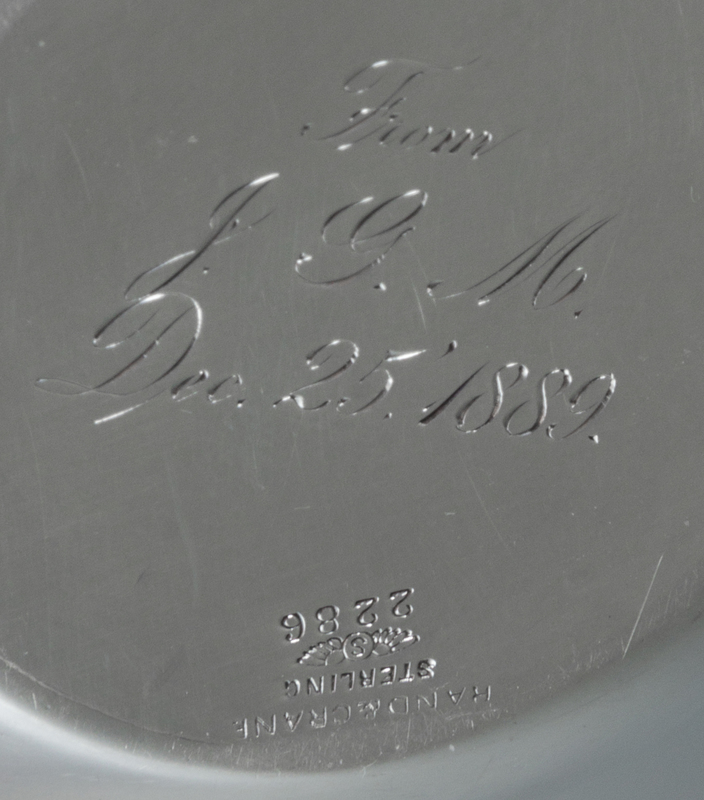 worked to show clusters of chrysanthemums and other foliage, monogrammed EEM to the body and with engraved inscription From J.G.W. Dec. 25, 1889.