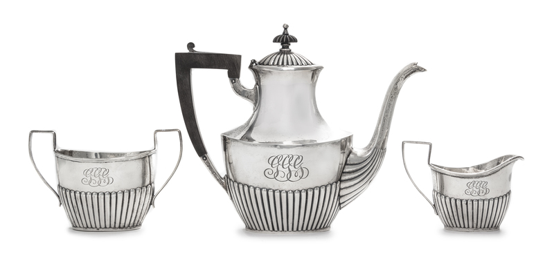comprising a coffee pot with an ebony handle and finial, a two-handled sugar and a creamer, each monogrammed GGG.