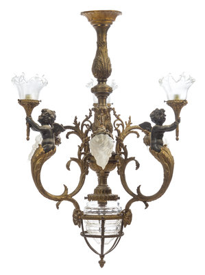 having a baluster form standard issuing the scrolling candle arms ending in putti supported lighting elements