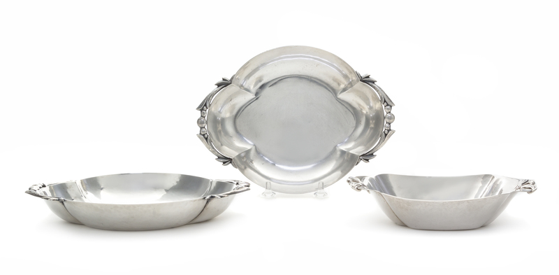 each of shaped oval form, the ends decorated with buds and berries flanked by leaves, together with a smaller shaped rectangular dish.