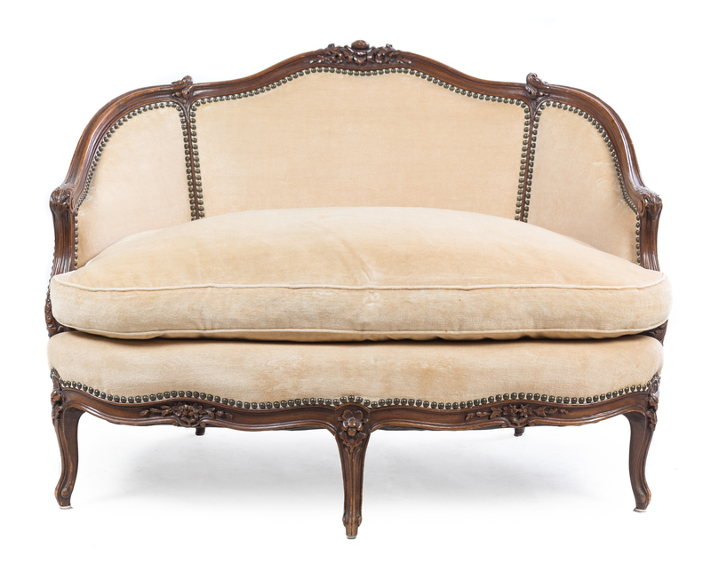 the serpentine crest rail above a padded back and a cushion seat, raised on cabriole legs with floral decoration.