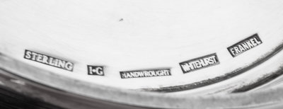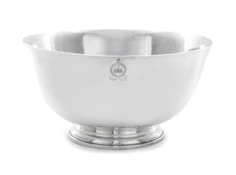 of circular form having a slightly flared rim and a spot-hammered surface, engraved with a depiction of Colonial Williamsburg in a running foliate reserve above the inscription THAT THE FUTURE MAY LEARN FROM THE PAST, raised on a short stepped foot.