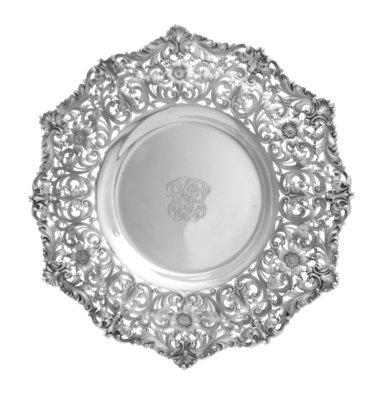 the border worked with floral and foliate motifs on a pierce decorated ground and centered by an engraved monogram.