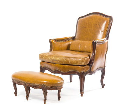 the shaped leather-padded back above a cushion seat raised on cabriole legs, the tabouret of oval form raised on similarly worked legs.