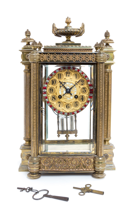 the circular segmented dial with Arabic numeral hours signed Tiffany & Co. New York, set in an architectural case topped by a flaming urn form finial flanked by pine cone finials and decorated with tracery and paterae.