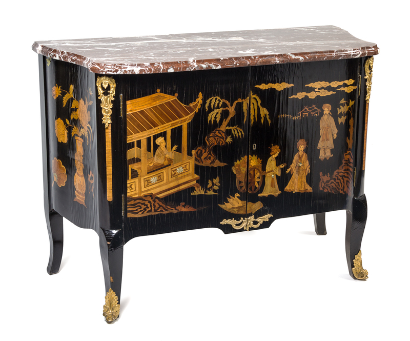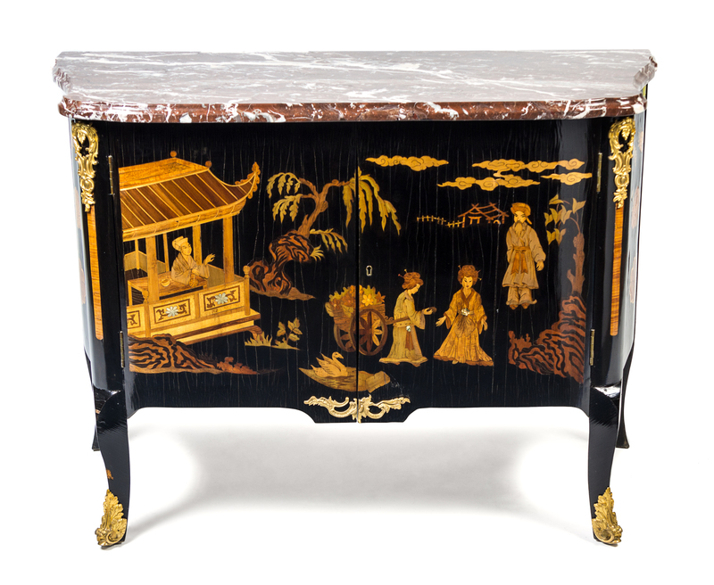 the serpentine front marble top above two doors enclosing a shelf, the front inlaid to show Chinese figures in a landscape, the sides with flower-filled vases, raised on cabriole legs ending in sabots.