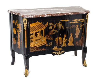 A Louis XV/XVI Transitional Style Ebonized Wood and Marquetry Commode