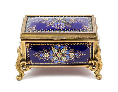 of rectangular form, the hinged lid having gilt and applied polychrome enamel decoration against a cobalt ground and opening to a fabric lined interior, the similarly decorated body raised on foliate scroll legs, apparently unmarked.