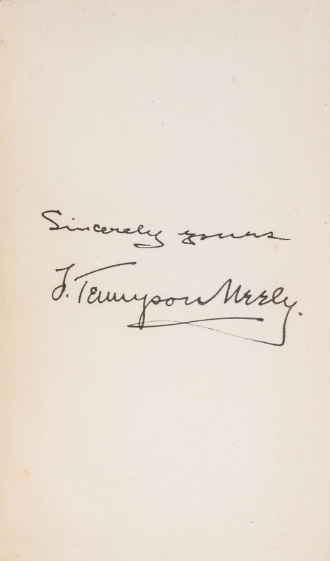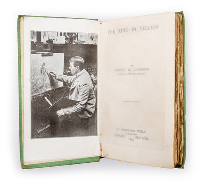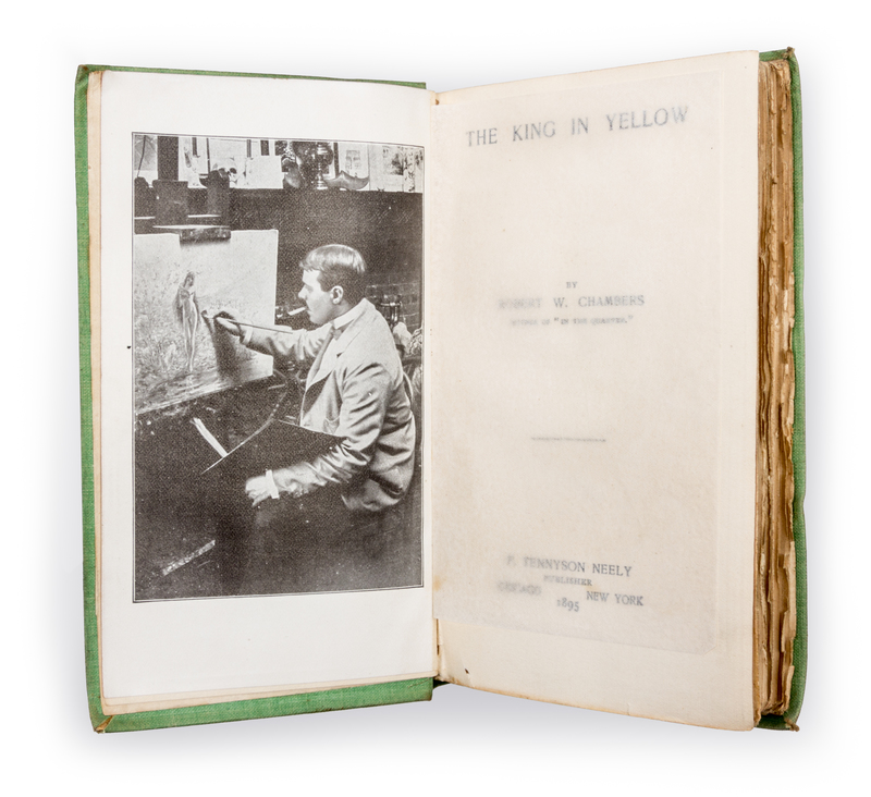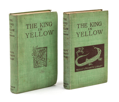 Two variant bindings of the first edition of The king in yellow. Chicago: F. Tennyson Neely, 1895.The first issue, without the frontispiece portrait and featuring a lizard design on the front board, is a presentation copy signed by the publisher. The later issue, also published in 1895, feaures a butterfly design on the rear board, with ownership inscription to front endpaper.Bleiler 396: "A small volume that is one of the basic documents in the history of fantastic fiction."