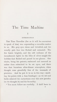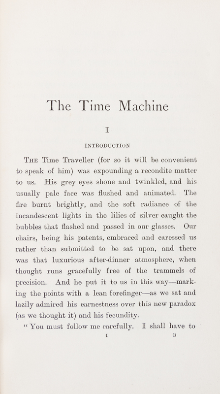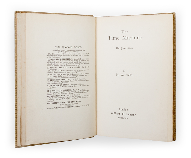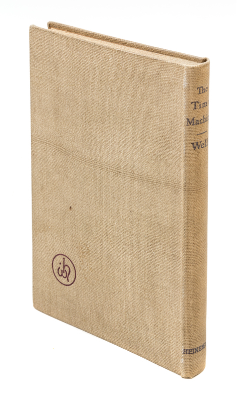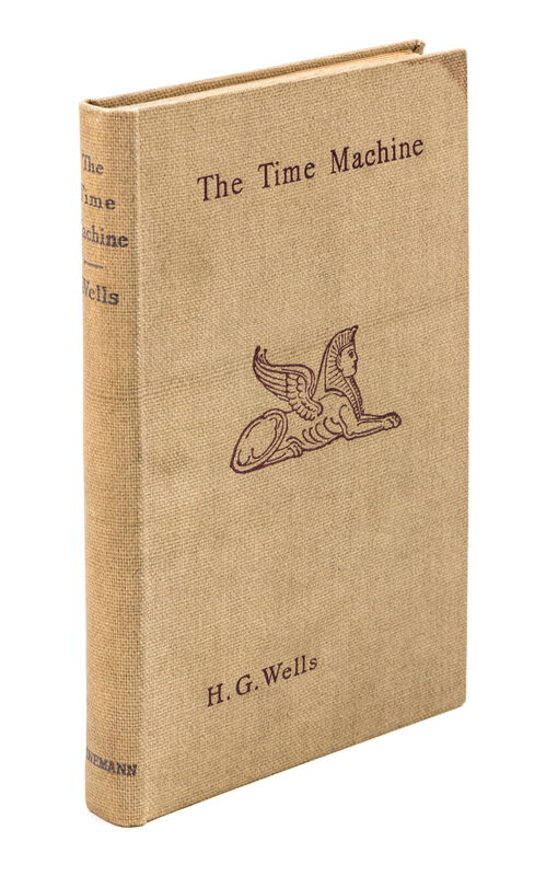 The time machine: an invention. London: William Heinemann, 1895. First edition. Tan cloth boards (18 cm. tall), decoratively stamped in purple. Staining to upper right corner of front board. Some foxing to endpapers. With eight pages of advertisements at rear.
