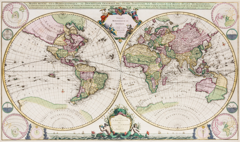 Mappe-monde geo-hydrographique, ou description generale du globe terrestre et aquatique en deux plans-hemispheres. Amsterdam or Paris: 1721. Hand-colored engraved twin-hemisphere world map on two sheets. Coat-of-arms of and dedication to the Dauphin of France at center top edge. Matted and framed (58 x 98 cm., sight).