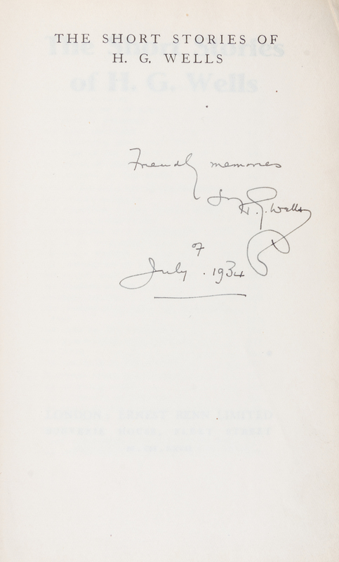 The short stories of H. G. Wells. London: Ernest Benn Limited, 1927. First edition, signed.Green cloth boards (19 cm. tall), with gilt lettering to spine. With author's inscription on half-title page ("Friendly memories...").