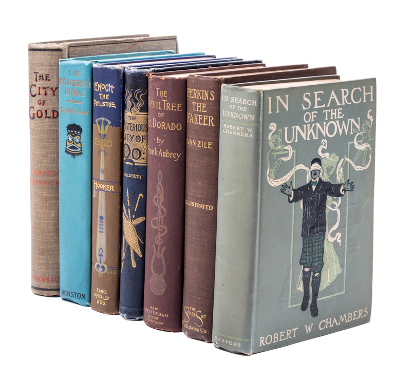 A group of seven pre-WWI works bound in decorative cloth, pertaining to the theme of the exotic. Including: (1) Charles Lotin Hildreth, The mysterious city of OO. New York: Belford Company, 1889; (2) Frank Aubrey, The devil-tree of El Dorado. New York: New Amsterdam Book Company, 1897; (3) Edward Markwick, The city of gold: a tale of sport... travel, and adventure in the heart of the dark continent. London: W. Thacker & Co., 1898; (4) Le Roy Hooker, Enoch the Philistine: a traditional romance of Philstia, Egypt and the Great Pyramid, Chicago: Rand, McNally & Company, 1898; (5) Edward S. van Zile, Perkins the Fakeer: a travesty on reincarnation. New York: The Smart Set, 1903; (6) Robert W. Chambers, In search of the unknown. New York: Haper & Brothers, 1904; and (7) Beatrice Grimshaw, The sorcerer's stone. Philadelphia: The John C. Winston Company, 1914.