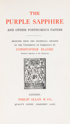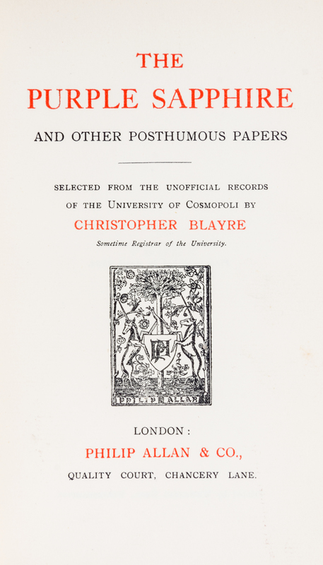 The purple sapphire and other posthumous papers. London: Philip Allan & Co., 1921. First edition, signed.Cloth boards (19 cm. tall), with some sunning to spine. Inscribed and dated by Blayer on the front endpaper.
