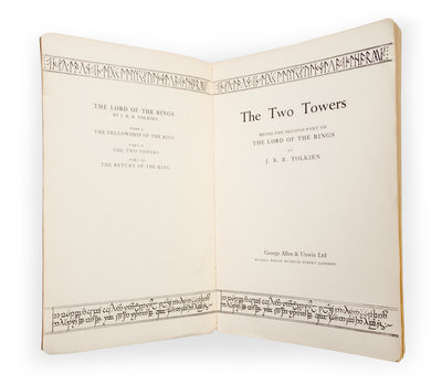 The two towers. London: George Allen & Unwin, 1954. Proof copy.Brown paper wrappers (23 cm. tall), with typescript paper labels to front wrapper, for both title and price (partially clipped). With rear wrapper starting to lift at joint.In this proof, the synopsis (save for its title) remains blank on pages 9 through 11.
