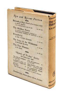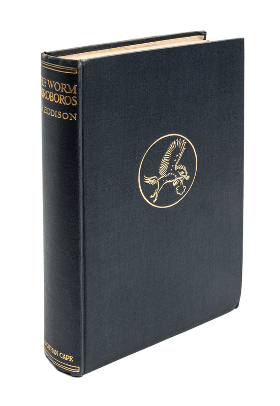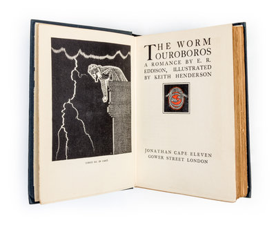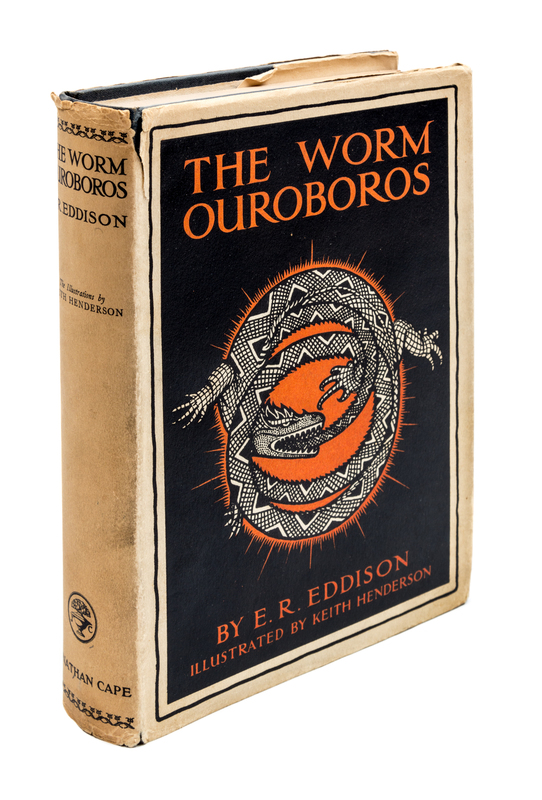 The worm ouroboros: a romance. London: Jonathan Cape, 1922.Cloth boards, with gilt stamp design to front board and gilt lettering to spine. With full jacket, showing some sunning and minor tears to top of spine. With frontispiece and five full-page illustrations from Keith Henderson. Hinges tender, with cosmetic splits."A most curious story. Here is no photographic realism, no divorces, no drugs, nor neurasthenics, but the humours and splendours of a spacious life, the clash of noble wills and circumstances."
