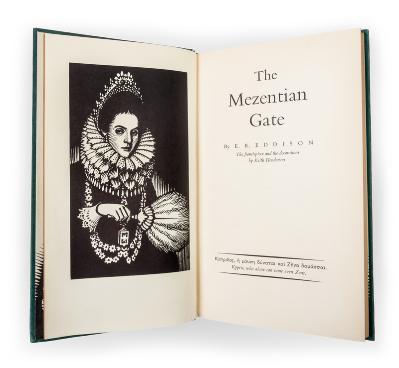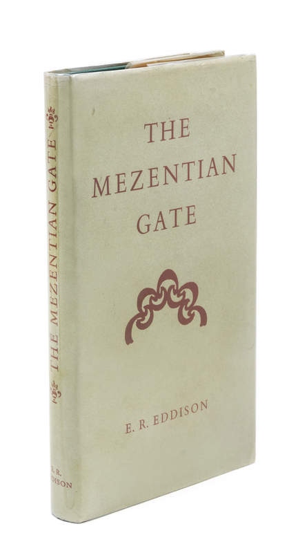 The mezentian gate. Printed at the Curwen Press for Mrs. E. R. Eddison, 1958. First edition.Green cloth boards (21 cm. tall). With price-clipped jacket, showing light wear to edges; otherwise bright and clean. With ownership inscription to front pastedown.
