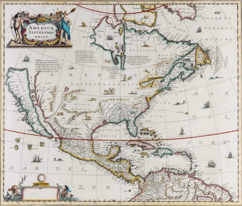 America septentrionalis. Amsterdam, 1639. Hand-colored engraved map of North America (48 x 60 cm.); matted and framed. French text on verso.This important map of North America had great influence in perpetuating the theory of California as an island. The title cartouche features several Native Americans and two comely mermaids flank the imprint cartouche. This is the rare, first state with the imprint cartouche blank and French text on verso, published between 1639-1649.