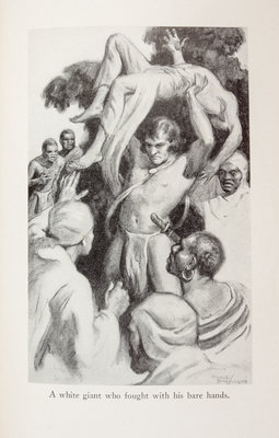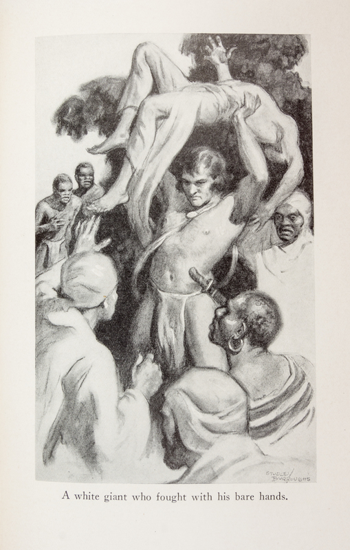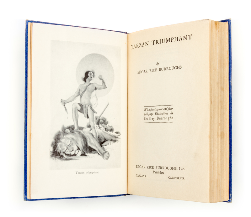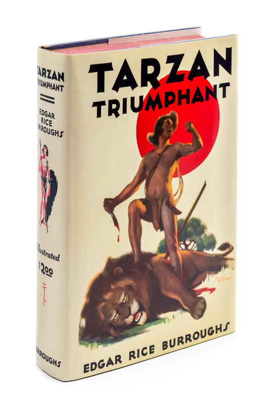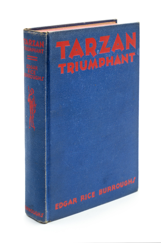 Tarzan triumphant. Tarzana, CA: Edgar Rice Burroughs, Inc. Publishers, 1932. First edition.Pebbled cloth boards (20 cm. tall), lettered in reddish-orange, with red top-stain; rubbing to spine ends and minor staining to rear panel. With quality facsimile jacket. Cosmetic split to rear hinge of text-block. Illustrated by Studley Burroughs, with frontispiece and four additional black-and-white plates.
