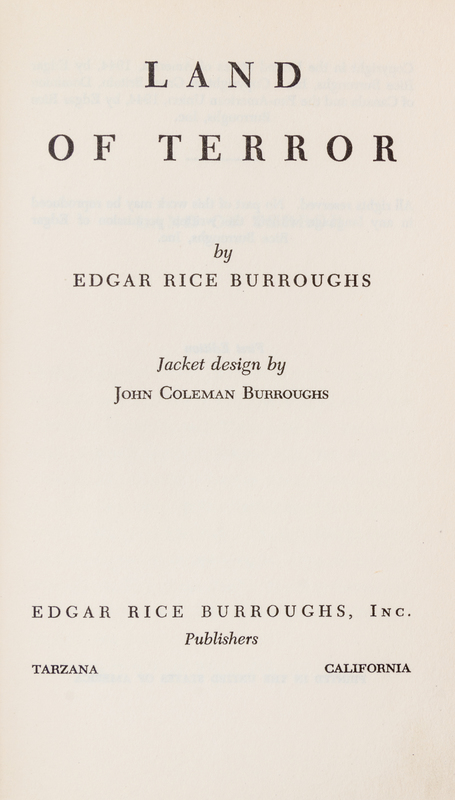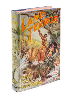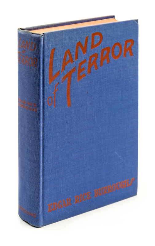 Land of terror. Tarzana, CA: Edgar Rice Burroughs, Inc. Publishers, 1944. First edition.Blue cloth boards (20 cm. tall), lettered in reddish-orange, with red top-stain. Slight rubbing to spine ends. With full facsimile jacket, originally designed by John Coleman Burroughs; minor shelf-wear and 2 cm. tear to front hinge.