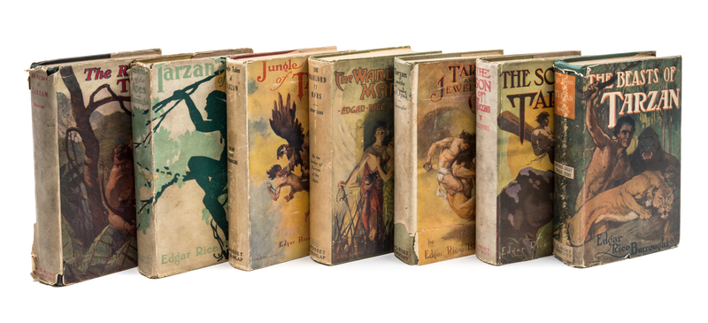 A group of five early Tarzan reprints from Chicago publisher A. L. Burt: (1) Tarzan of the apes, 1914; (2) The return of Tarzan, 1915; (3) The beasts of Tarzan, 1916; (4) The son of Tarzan, 1917; and (5) Tarzan and the Opar, 1918. All in full jackets, with expected wear, with the exception of the final volume, which has the bottom portion of the jacket torn, but present.Also included are two early reprints from Grosset & Dunlap, in full jackets (worn) comprising: The warlord of Mars, 1919, and Jungle tales of Tarzan, 1919.