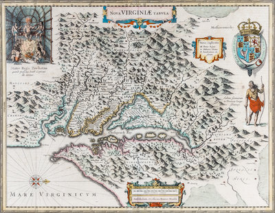 Nova Virginiae tabula, from Le theatre du monde, ou, nouvel atlas. Amsterdam, 1643-1650.Hand-colored engraved map (48 x 59 cm., sheet); framed and matted. French text on verso. The early settlement of Jamestown is noted as Iamestowne. The map was derived from Capt. John Smith's map of 1612, which was the first to depict the Bay and its tributaries with any accuracy. The plate was engraved by Dirck Grijp and originally published by Jodocus Hondius Jr. in 1618. It was purchased by Willem Blaeu shortly after Hondius' death (1629), with Blaeu's imprint replacing that of Hondius.