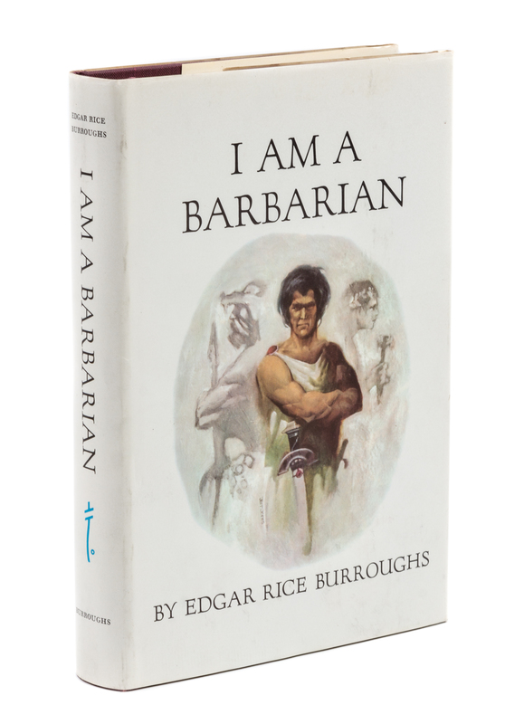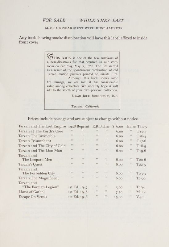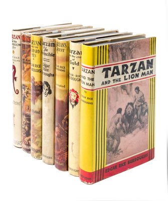 A group of seven later reprints, from Edgar Rice Burroughs, Inc. All in gray cloth boards with blue-stamped design and lettering. Some of these copies are with printed labels affixed to front endpapers reading: "This book is one of the few survivors of a near-disastrous fire that occurred in our store-room on Saturday, May 3, 1958. The fire started as a result of the spontaneous combustion of old Tarzan motion pictures printed on nitrate film. Although this book shows some fire damage, we are told that it has considerable value among collectrs. We sincerely hope it will add to the worth of your own personal collection."Accompanied by reprint price list, which justifies said label and announces the publication of an otherwise unpublished ERB story: I am a barbarian; also included in this lot. Red cloth boards (20 cm. tall), with gilt lettering and full jacket.