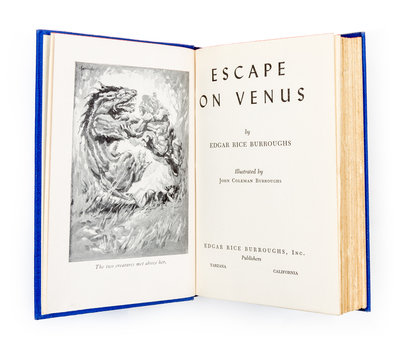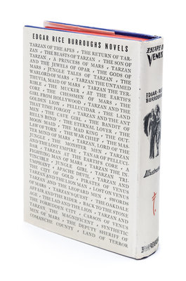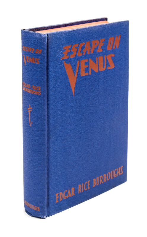 Escape on Venus. Tarzana, CA: Edgar Rice Burroughs, Inc. Publishers, 1946. First edition.Pebbled blue cloth boards (20 cm. tall), lettered in reddish orange, with red top-stain. With full facsimile jacket, showing some edge-wear; Very Good. Illustrated with frontispiece and four additional black-and-white plates. Label to front endpaper referring to 1958 store-room fire.