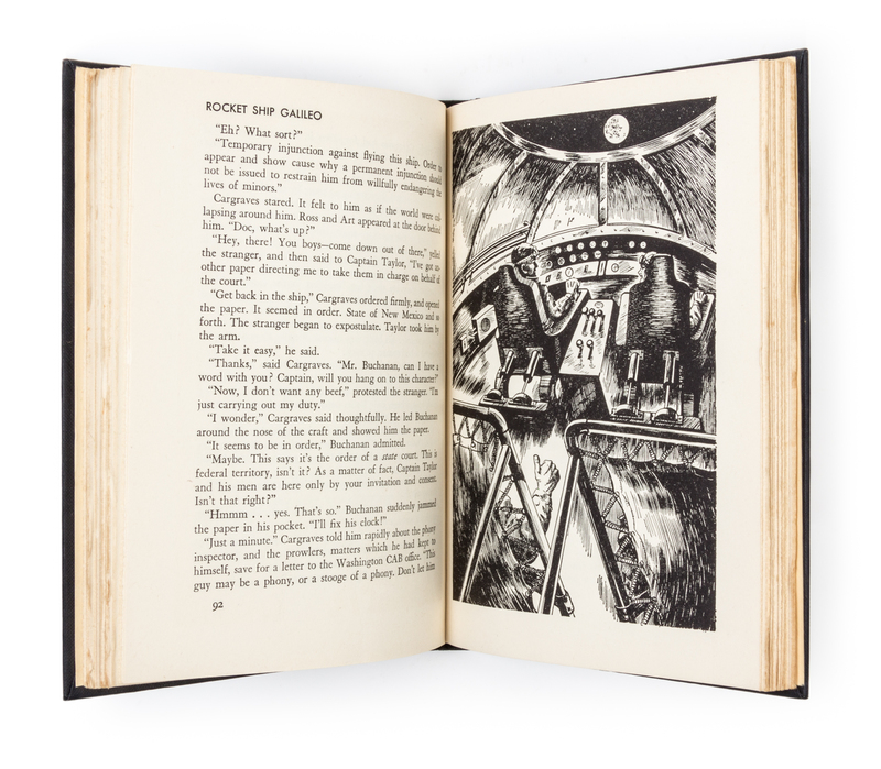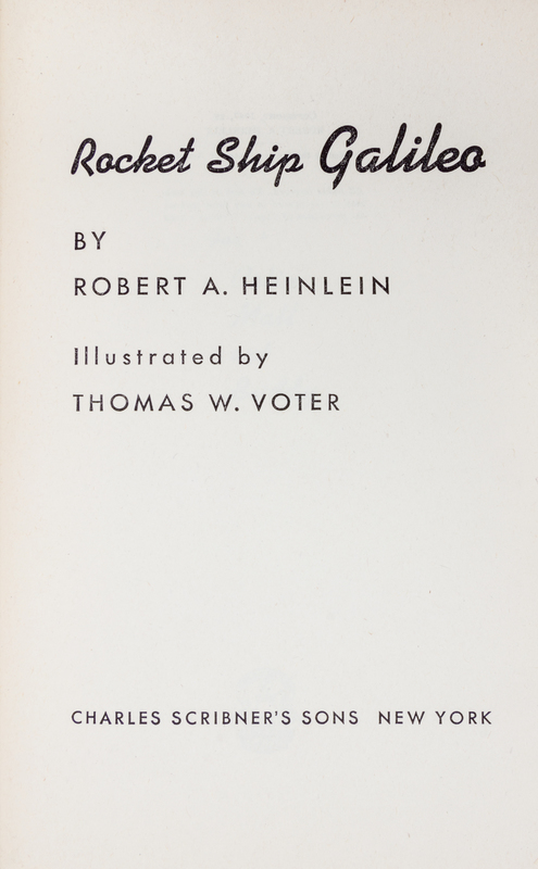 Rocket ship Galileo. New York: Charles Scribner's Sons, 1947. First edition.Decorative cloth boards (21 cm. tall), with full jacket, showing minor rubbing to base of spine. Illustrated by Thomas W. Voter. In exceptional condition.