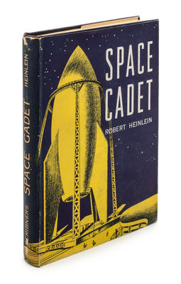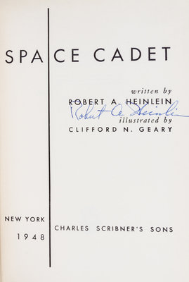 Space cadet. New York: Charles Scribner's Sons, 1948. First edition, signed. Decorative cloth boards (21 cm. tall), with full jacket, showing some rubbing to spine. Signed by Heinlein on title page.