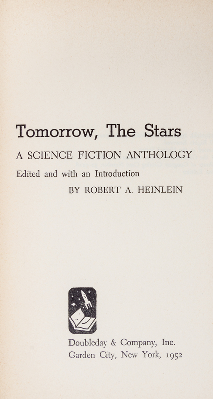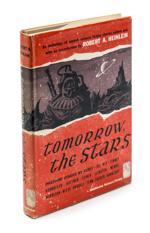 Tomorrow the stars: a science fiction anthology. New York: Doubleday, 1952. First edition, signed.Cloth boards (21 cm. tall), with fulll jacket illustrated by Richard Powers; sunning to spine, with ghost of price sticker to rear panel. Signed by Heinlein on front endpaper.An anthology edited by Heinlein, who also provides his rationale in the introduction: "The purpose of this book is to give you pleasure."